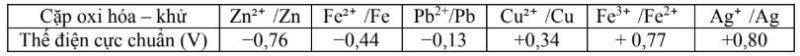 Cho bảng giá trị thế điện cực chuẩn của các cặp oxi hóa – khử như sau: