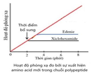 a) Khi bổ sung Edenie, quá trình dịch mã vẫn tiếp tục diễn ra thêm khoảng 1 phút rồi sau đó dừng lại; trong khi đó quá trình dịch mã sẽ bị dừng ngay lập tức khi bổ sung Xiclohexamide.