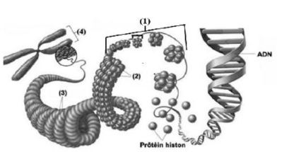 Câu 5: Hình bên mô tả cấu trúc cấu trúc siêu hiền vi của NST ở sinh vật nhân thực. Cấu trúc tương ứng với chữ thích số (1) có đường kính bao nhiêu nanomet (nm)?