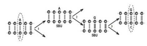 Câu 6: Hình dưới mô tả cơ chế phát sinh đột biến gene khi có sự tác động của tác nhân đột biến 5-bromuracil (5BU). Tính từ khi 5BU liên kết với nucleotide adenine thì sau mấy lần nhân đôi sẽ phát sinh gene đột biến?
