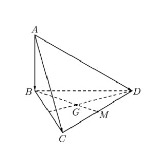 Câu 2. Cho tứ diện $ABCD$ có $AB \perp (BCD)$, $AB = 4cm$, tam giác $BCD$ đều cạnh 3 cm, $G$ là trọng tâm tam giác $BCD$, điểm $M$ là trung điểm $CD$. Đặt $\overrightarrow{AB} = \vec{a}$, $\overrightarrow{AC} = \vec{b}$, $\overrightarrow{AD} = \vec{c}$.