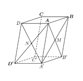 Câu 3. Cho hình hộp $ABCD.A’B’C’D’$, biết điểm $A(0; 0; 0)$, $B(1; 0; 0)$, $C(1; 2; 0)$, $D'(-1; 3; 5)$. Gọi $M, N$ lần lượt là tâm của các hình bình hành $ABBA’$, $ADD’A’$.