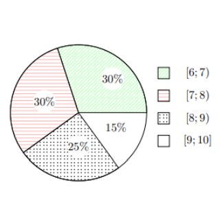 Câu 4. Biểu đồ tần suất hình quạt trong hình bên mô tả bảng phân bố tần suất ghép nhóm của dữ liệu điểm thi của 40 học sinh lớp 12A trong kì thi học kì 1 môn Toán (thang điểm 10).