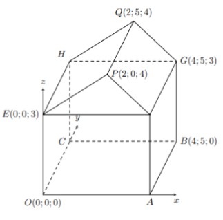 Câu 3. Hình minh họa so đồ một ngôi nhà trong hệ trục tọa độ $Oxyz$, trong đó nền nhà, bốn bức tường và hai mái nhà đều là hình chữ nhật. Tính góc độc của mái nhà, tức là tìm số đo của góc nhị diện có cạnh là đường thẳng $FG$, hai mặt lần lượt là $(FGQP)$ và $(FGHE)$ (làm tròn kết quả đến hàng phần mười của độ).