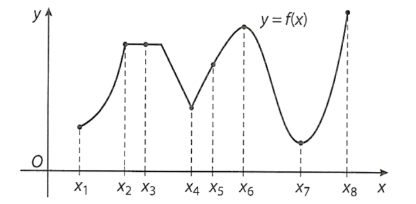 d) Hàm số đạt cực tiểu tại các điểm $x_4$ và $x_7$.