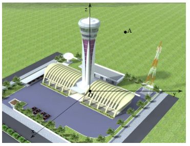 Câu 4. Một tháp trung tâm kiểm soát không lưu ở sân bay cao 80 m sử dụng ra đa có phạm vi theo dõi 500km được đặt trên đỉnh tháp. Chọn hệ trục tọa độ $Oxyz$ có gốc $O$ trùng với vị trí chân tháp, mặt phẳng $(Oxy)$ trùng với mặt đất sao cho trục $Ox$ hướng về phía tây, trục $Oy$ hướng về phía nam, trục $Oz$ hướng thẳng đứng lên phía trên (Hình) (đơn vị trên mỗi trục tính theo kilômét).