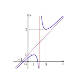 Câu 5: Cho đồ thị hàm số $y = f(x)$ như hình vẽ có đường tiệm cận xiên $y = ax + b$. Khi đó, $a + b$ bằng bao nhiêu?