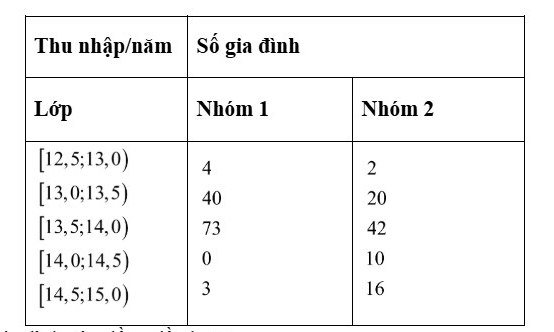 Câu 10: Thu nhập gia định/năm của hai nhóm dân cư ở hai xã của một huyện được cho trong bảng sau: (đv: triệu đồng)