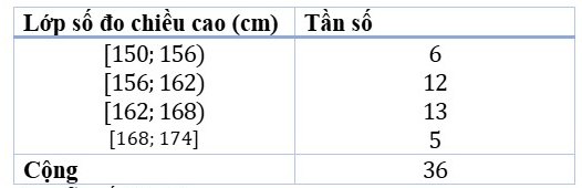 Câu 12: Để chuẩn bị may đồng phục cho học sinh, người ta đo chiều cao của 36 học sinh trong một lớp học và thu được các số liệu thống kê ghép nhóm được trình bày trong bảng dưới đây.