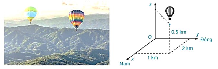 Câu 5: Hai chiếc khinh khí cầu bay lên từ cùng một địa điểm. Chiếc thứ nhất nằm cách điểm xuất phát $2 km$ về phía nam và $1 km$ về phía đông, đồng thời cách mặt đất $0,5 km$. Chiếc thứ hai nằm cách điểm xuất phát $1 km$ về phía bắc và $1,5 km$ về phía tây, đồng thời cách mặt đất $0,8 km$.