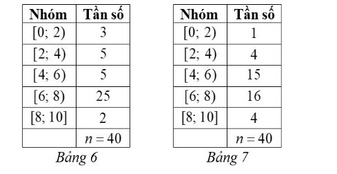 Câu 4: Kết quả kiểm tra môn Toán (cùng đề) của học sinh hai lớp 12A và 12B được cho lần lượt bởi mẫu số liệu ghép nhóm ở Bảng 6, Bảng 7.