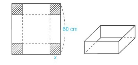 Câu 1: Từ một tấm bia carton hình vuông có độ dài cạnh bằng $60cm$, người ta cắt bốn hình vuông bằng nhau ở bốn góc rồi gấp thành một chiếc hộp có dạng hình hộp chữ nhật không có nắp (như hình vẽ). Tính cạnh của các hình vuông bị cắt sao cho thể tích của chiếc hộp là lớn nhất.