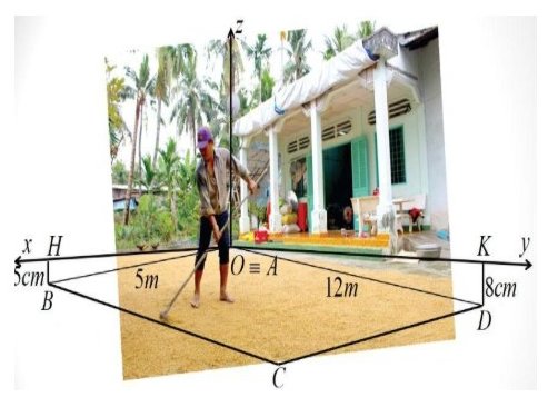 Câu 5: Ở vùng nông thôn Quảng Trị, trước mỗi nhà thường có một cái sân rộng để phơi lúa vào mùa gặt và cũng là nơi để tổ chức một số sự kiện của gia đình: đám cưới, đám hỏi, đám tang,… Bác Tý tính xây một cái sân trước cửa nhà hình chữ nhật $ABCD$ có độ dài các cạnh lần lượt là $AB = 5m, AD = 12m$. Để thuận tiện cho việc thoát nước khi trời mưa và khi rửa sân nên bác Tý xây vị trí $B$ thấp hơn vị trí $A$ là $5cm$, vị trí $D$ thấp hơn vị trí $A$ là $8cm$. Chọn hệ trục tọa độ $Oxyz$ như hình vẽ. Hãy xác định xem vị trí $C$ thấp hơn vị trí $A$ bao nhiêu $cm$? (làm tròn đến $cm$).