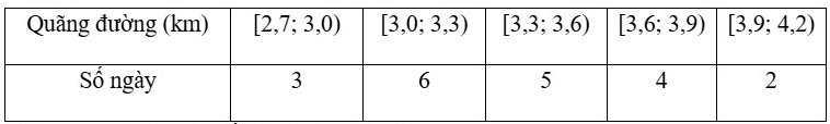 Câu 12: Mỗi ngày bác Hương đều đi bộ để rèn luyện sức khỏe. Quãng đường đi bộ mỗi ngày (đơn vị: km) của bác Hương trong 20 ngày được thống kê lại ở bảng sau: