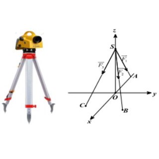 Câu 5: Một chiếc máy đo đạc trắc địa được đặt trên một giá đỡ ba chân với điểm đặt $S(0; 0; 4)$ và các điểm tiếp xúc với mặt đất của ba chân lần lượt là $A(-2; 0; 0), B(1; \sqrt{3}; 0), C(1; -\sqrt{3}; 0)$ (đơn vị $cm$). Biết rằng trọng lực tác dụng lên chiếc máy có độ lớn là 30N và được phân bố thành ba lực $\overrightarrow{F_1}, \overrightarrow{F_2}, \overrightarrow{F_3}$ có độ lớn bằng nhau như hình dưới
