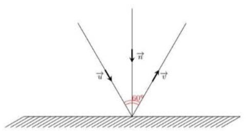 Câu 5: Một tia sáng chiếu tới gương phẳng và bị phản xa. Gọi $\vec{u}, \vec{v}, \vec{n}$ lần lượt là các vecto có độ dài bằng 1 dọc theo tia tới, tia phản xa và pháp tuyến như hình vẽ. Khẳng định nào sau đây đúng?
