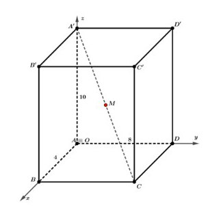 Câu 8: Một căn phòng có dạng hình hộp chữ nhật $ABCD.A’B’C’D’$ với chiều rộng $AB = 4$, chiều dài $AD = 8$, chiều cao $AA’ = 10$ được gắn vào hệ trục $Oxyz$ như hình vẽ
