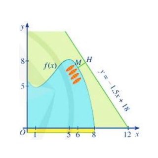 Câu 1: Một hồ nước nhân tạo được xây dựng trong một công viên giải trí. Được mô hình hóa như hình bên dưới. Trong mô hình mô hình hóa, nó được giới hạn bởi các trục tọa độ và đồ thị của hàm số $y = f(x) = \frac{1}{10}(-x^3 + 9x^2 – 15x + 56)$.