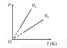 Câu 15: Một khối khí lí tưởng thực hiện quá trình biến đổi đẳng tích ở hai thể tích khác nhau được biểu diễn hình dưới đây. So sánh giá trị giữa $V_1$ và $V_2$.