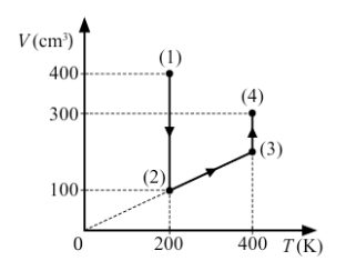 Câu 4: Một mol khối khí oxygen lí tưởng thực hiện một chu kì biến đổi trạng thái được cho như hình bên. Tìm thể tích (cm³) của khối khí ở trạng thái (3). Viết kết quả đến phần nguyên.