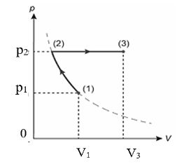 b) Trong hệ tọa độ VÔT, đường biểu diễn quá trình biến đổi trạng thái (1) $\rightarrow$ (2) là đường hyperbol, đường biểu diễn quá trình (2) $\rightarrow$ (3) là đường thẳng có độ góc tạo độ.