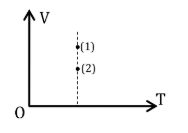 Câu 8: Trên đồ thị V – T biểu diễn hai trạng thái (1) và (2) của cùng một khối lượng khí xác định. Gọi áp suất của các trạng thái (1), (2) lần lượt là $p_1$, $p_2$. Thông tin nào sau đây là đúng?
