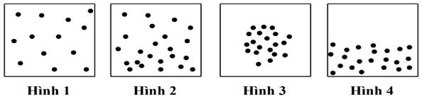 Câu 4. Hình biểu diễn đúng sự phân bố mật độ của phân tử khí trong một bình kín là [4 hình vuông với các chấm phân bố khác nhau: