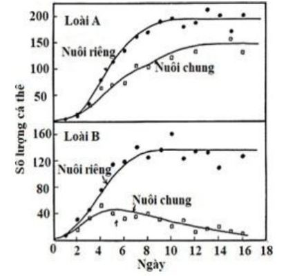 Câu 4. Người ta tiến hành thí nghiệm nghiên cứu tăng trưởng của quần thể 2 loài động vật nguyên sinh (Protozoa) A và B trong điều kiện nuôi riêng rẽ và nuôi chung với nhau. Các yếu tố môi trường như nhiệt độ, pH trong bình nuôi ở các thí nghiệm là giống nhau, nồng độ chất dinh dưỡng trong bình nuôi được duy trì ổn định trong suốt thời gian thí nghiệm. Số lượng cá thể của mỗi quần thể tại thời điểm bắt đầu thí nghiệm là như nhau. Kết quả thí nghiệm được mô tả ở đồ thị hình dưới đây. Dựa vào đồ thị, cho biết các phát biểu sau đây đúng hay sai?
