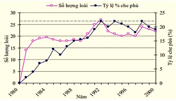 (II). Năm 1993, độ che phủ đạt mức cực đại sau đó bắt đầu có sự biến đổi nhẹ theo sự tăng hay giảm của số lượng loài thực vật.