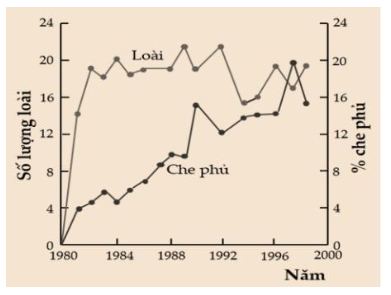 Câu 18: Hình vẽ dưới đây mô tả kết quả theo dõi sự thay đổi số lượng và mức độ che phủ của thảm thực vật sau khi núi lửa phun trào tại St Helens ở phía Tây nam Washington (Mỹ) vào năm 1980.