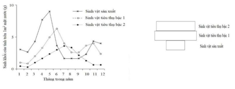 Câu 5: Biểu đồ dưới đây mô tả sự thay đổi về sinh khối trong suốt một năm của một hệ sinh thái dưới nước. Hình tháp sinh khối sau đây phù hợp để mô tả sự thay đổi sinh khối vào tháng nào trong năm?