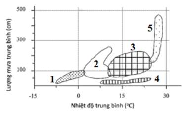 Câu 6. Mối quan hệ giữa nhiệt độ trung bình và lượng mưa trung bình trong năm của các khu hệ sinh thái trên cạn được thể hiện như hình sau: