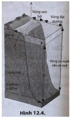 Câu 3: So đồ hình 12.4 thể hiện mật cắt tổng quát của đại dương với nhiều vùng khác nhau tương ứng với các chữ cái. Các phát biểu sau đây là Đúng hay Sai về đặc điểm sinh thái trong các vùng này?