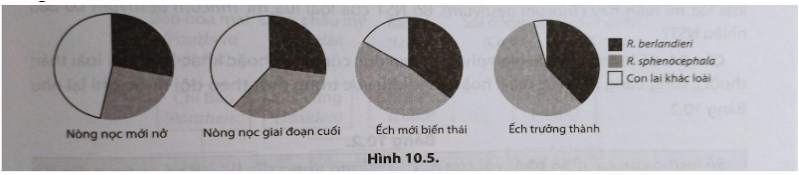 Câu 2: Khi sống chung với nhau trong cùng khu vực, hai loài ếch Rana berlandieri và R. sphenocephala thường có mùa sinh sản không trùng nhau, nhưng khi sống tách biệt thì cả hai loài đều sinh sản vào mùa xuân và mùa thu. Trong một thí nghiệm, các nhà khoa học nghiên cứu số ếch con được sinh ra, sống sót và phát triển trong khu vực ao só sự gặp gỡ, giao phối và sinh sản của cả hai loài này. Kết quả thu được như trong hình 10.5