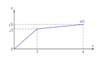Câu 3: Một vật chuyển động với hàm số gia tốc là $a(t)$. Biết rằng đồ thị hàm số $a(t)$ trên đoạn $[0; 6]$ được cho như hình dưới đây và vận tốc tại thời điểm $t = 0$ là $v(0) = 1,9(m/s)$. Tại thời điểm $t = 6$ giây, vận tốc của vật là bao nhiêu?