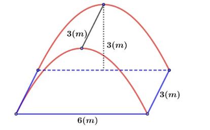 Câu 4: Để chắn bị cho hồi trại đo Đoàn trường tổ chức, lớp 12B dự định dựng một cái lều trại có dạng hình chỏm như hình vẽ. Nền của lều trại là một hình chữ nhật có kích thước bé ngang 3 mét, chiều dài 6 mét, đỉnh trại cách nền 3 mét. Tính thể tích phần không gian bên trong lều trại.