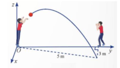 Câu 1: Hai học sinh đang chuyền bóng. Bạn nữ ném bóng cho bạn nam. Quả bóng bay trên không, lệch sang phải và rơi xuống tại vị trí cách bạn nam 3 m, cách bạn nữ 5 m (Hình vẽ). Cho biết quỹ đạo của quả bóng nằm trong mặt phẳng (P) vuông góc với mặt đất. Hãy viết phương trình của (P) trong không gian Oxyz được mô tả hình học hình vẽ.