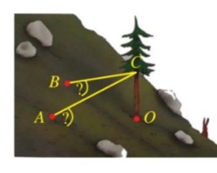 Câu 4: Trên một sườn núi (có độ nghiêng đều), người ta trồng một cây thông và muốn giữ nó không bị nghiêng bằng hai sợi dây neo như hình bên. Giả thiết cây thông mọc thẳng đứng và trong một hệ tọa độ phù hợp, các điểm $O$ (gốc cây thông) và $A, B$ (nơi buộc dây neo) có tọa độ tương ứng là $O(0; 0; 0), A(3; -4; 2), B(-5; -2; 1)$, đơn vị trên mỗi trục tọa độ là mét. Biết rằng hai dây neo đều được buộc vào cây thông tại điểm $(0; 0; 5)$ và được kéo căng tạo thành các đoạn thẳng. Tính tổng các góc tạo bởi mỗi dây neo và mặt phẳng sườn núi (làm tròn kết quả đến hàng đơn vị của độ).
