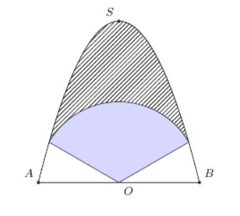 Biết $OS = AB = 4$ m, $O$ là trung điểm $AB$. Parabol trên được chia thành ba phần để sơn ba màu khác nhau với mức phí như sau: phần trên là phần kẻ sọc có giá $160.000$ đồng/m², phần giữa là hình quat tâm $O$, bán kính $2$ m được tô đậm có giá $200.000$ đồng/m², phần còn lại có giá $250.000$ đồng/m².