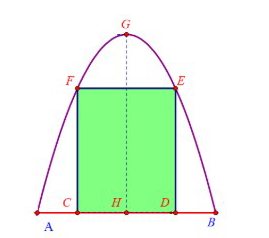 Câu 3. Chị Minh Hiền muốn làm một cái cổng hình Parabol như hình vẽ bên dưới. Chiều cao $GH = 4m$, chiều rộng $AB = 4m$, $AC = BD = 0,9m$. Chị Minh Hiền làm hai cánh cổng khi đóng lại là hình chữ nhật $CDEF$ tô đậm có giá là $1200000$ đồng/m², còn các phần để trang làm xiên hoa có giá là $900000$ đồng/m². Tính tổng số tiền để làm hai phần nổi trên (đơn vị: triệu đồng, kết quả làm tròn đến hàng phần chục)