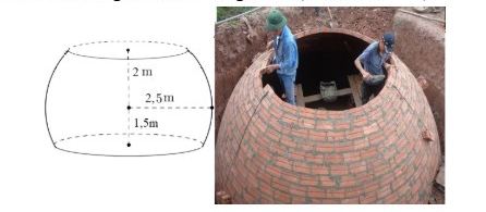 Câu 19. Mặt trong của một hầm biogas có hình dạng là một phần của mặt cầu đã cắt bỏ hai phần của nó bằng hai mặt phẳng song song với nhau (như hình vẽ). Bán kính của mặt cầu bằng $2,5m$. Mặt đáy phía dưới cách tâm một khoảng bằng $1,5m$. Mặt đáy phía trên cách tâm một khoảng bằng $2m$. Tính thể tích phần bên trong của hầm biogas đó (đơn vị là $m^3$)