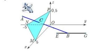 Câu 20. Một máy bay đang ở vị trí điểm $A(3,5; -2; 0,4)$ và sẽ hạ cánh ở vị trí điểm $B(3,5; 5; 0)$ trên đường băng $EG$ được mô hình hóa trong hệ trục tọa độ $Oxyz$ như hình vẽ bên dưới (đơn vị trên mỗi trục tọa độ là kilômét). Có một lớp mây được mô phỏng bởi một mặt phẳng $(\alpha)$ đi qua ba điểm $M(5; 0; 0)$, $N(0; -5; 0)$ và $P(0; 0; 0,5)$. Tìm tọa độ của điểm $C$ là vị trí mà máy bay xuyên qua đám mây để hạ cánh?