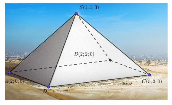 Câu 5. Ai Cập được biết đến với nhiều kim tự tháp. Các kim tự tháp có hình dạng là hình chóp tứ giác đều $SABCD$. Biết $A(2; 0; 0), B(2; 2; 0), C(0; 2; 0)$ và $S(1; 1; 3)$. Tính chiều cao của kim tự tháp?
