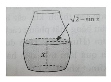 Câu 4. Một bình chứa nước có dạng như hình bên có chiều cao là $\frac{3\pi}{2}$ (dm). Nếu lượng nước trong bình có chiều cao $x$ (dm) thì mặt nước là hình tròn có bán kính là $\sqrt{2-\sin x}$ (dm) với $0 \leq x \leq \frac{3\pi}{2}$. Tính dung tích của bình (làm tròn kết quả đến hàng phần trăm của đêximét khối).