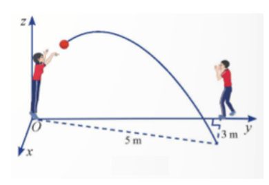Câu 1. Hai học sinh đang chuyền bóng. Bạn nữ ném bóng cho bạn nam. Quả bóng bay trên không, lách sang phải và rơi xuống tại vị trí cách bạn nam 3 m, cách bạn nữ 5 m (Hình vẽ). Cho biết quỹ đạo của quả bóng nằm trong mặt phẳng (P) vuông góc với mặt đất. Hãy viết phương trình của (P) trong không gian Oxyz được mô tả như trong hình vẽ.
