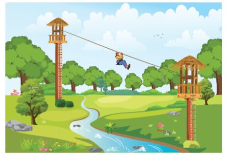 Câu 2. Trong một khu du lịch, người ta cho du khách trải nghiệm thiên nhiên bằng cách du theo đường trượt zipline từ vị trí A cao 15 m của tháp 1 này sang vị trí B cao 10 m của tháp 2 trong khung cảnh tuyệt đẹp xung quanh. Với hệ trục tọa độ Oxyz cho trước (đơn vị: mét), tọa độ của A và B lần lượt là (3; 2,5; 15) và (21; 27,5; 10) (hình vẽ).