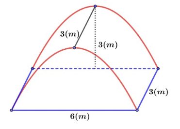 Câu 4. Để chuẩn bị cho hội trại do Đoàn trường tổ chức, lớp 12B dự định dựng một cái lều trại có dạng hình parabol như hình vẽ. Nền của lều trại là một hình chữ nhật có kích thước bề ngang 3 mét, chiều dài 6 mét, đỉnh trại cách nền 3 mét. Tính thể tích phần không gian bên trong lều trại.
