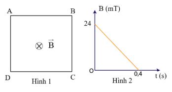 Một khung dây dẫn phẳng ABCD có diện tích 20 cm², gồm 20 vòng dây đặt trong từ trường đều có các đường sức từ vuông góc với mặt phẳng khung như hình 1. Biết vector cảm ứng từ $\vec{B}$ có chiều hướng từ ngoài vào trong mặt phẳng hình vẽ và có độ lớn phụ thuộc vào thời gian $t$ theo đồ thị hình 2.