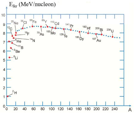 Câu 18. Hình dưới đây là đồ thị biểu diễn sự phân bố giá trị năng lượng liên kết riêng $(E_{lk})$ theo số khối (A) của các hạt nhân. Trong số các hạt nhân: $^{180}$Hf, $^{197}$Au, $^{209}$Pb, $^{238}$U, hạt nhân bền vững nhất là