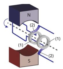 Câu 4. Hình bên là sơ đồ cấu tạo của một máy phát điện xoay chiều một pha: Khung dây dẫn phẳng có diện tích 80 cm², gồm 100 vòng dây, quay đều với tốc độ 90 vòng/phút quanh trục cố định vuông góc với đường sức từ của từ trường đều có cảm ứng từ B = 0,20 T.